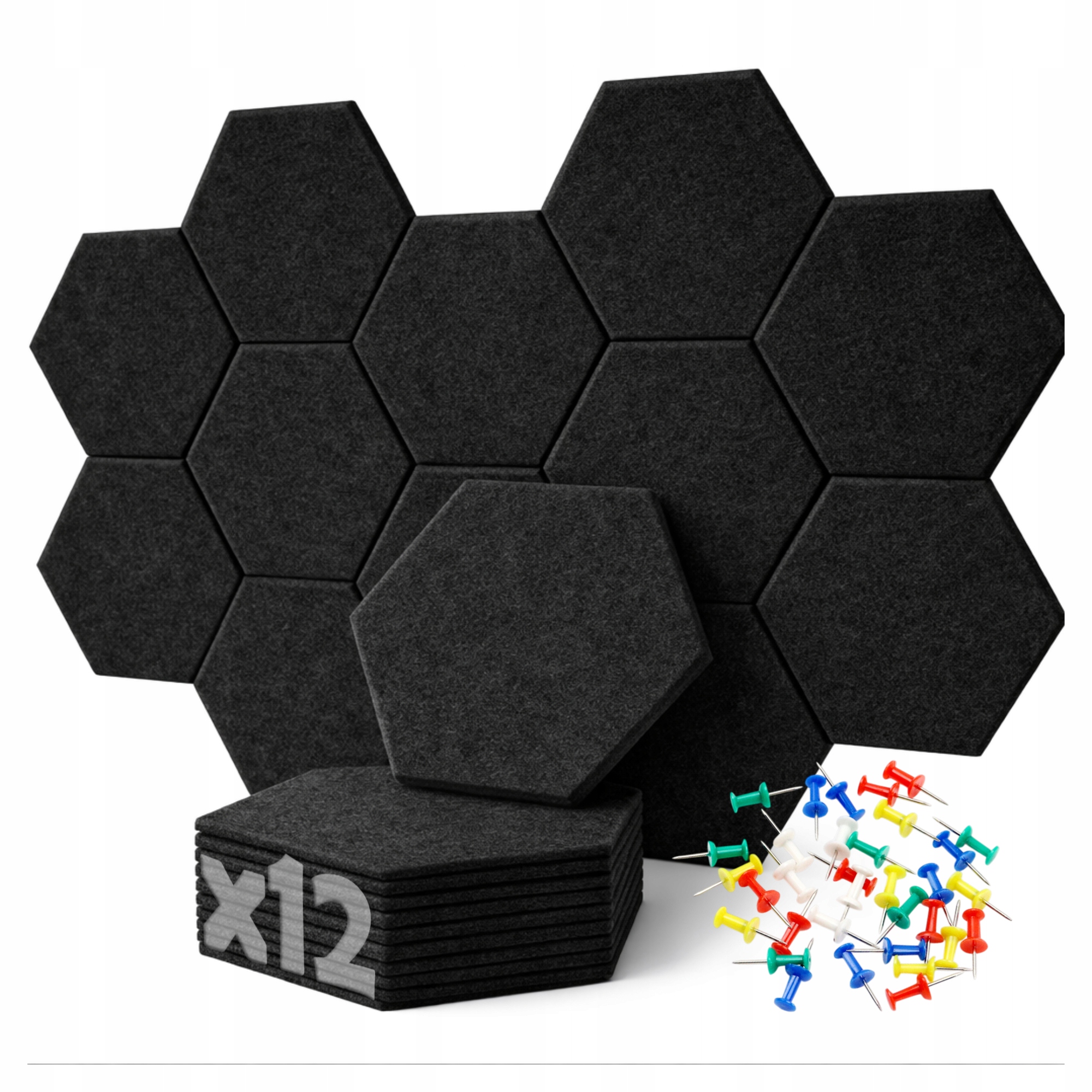 Panele akustyczne samoprzylepne HEXAGON 30x26x0,9cm, czarne, zestaw 12 sztuk